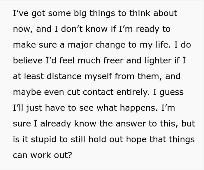 Fortunately for her, she does have an understanding and supportive partner, which is a key part of not feeling abandoned and isolated. Similarly, while we don’t have the details, one can hope that her parents take a good hard look at the situation and think about why she did what she did. In a perfect world, they will perhaps even understand why their actions were cruel and that they need to make amends.