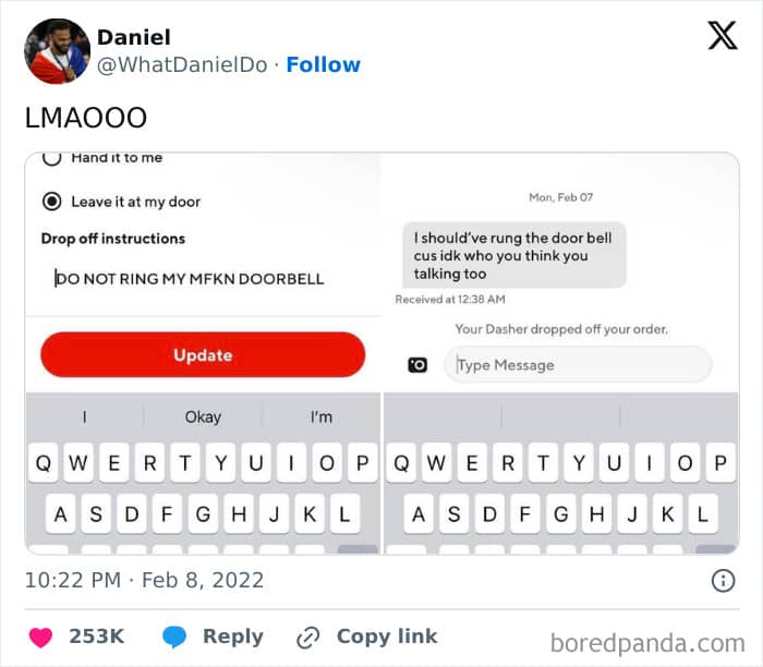 We has found the funniest and weirdest interactions between delivery drivers and their customers, and we’ve put them here in one place for you to enjoy. Truly, who hasn’t received a text from their delivery person that says they’ve been arrested or got a confirmation photo of their delivery with their kitty in it?