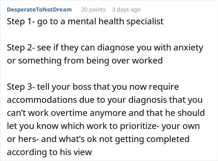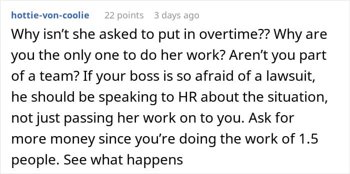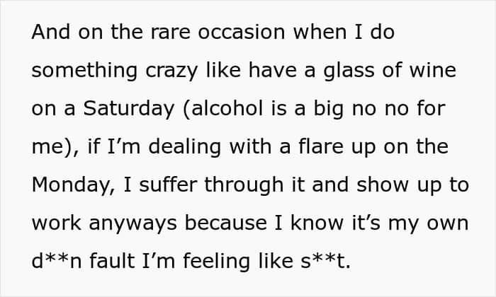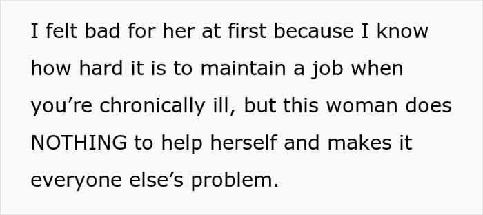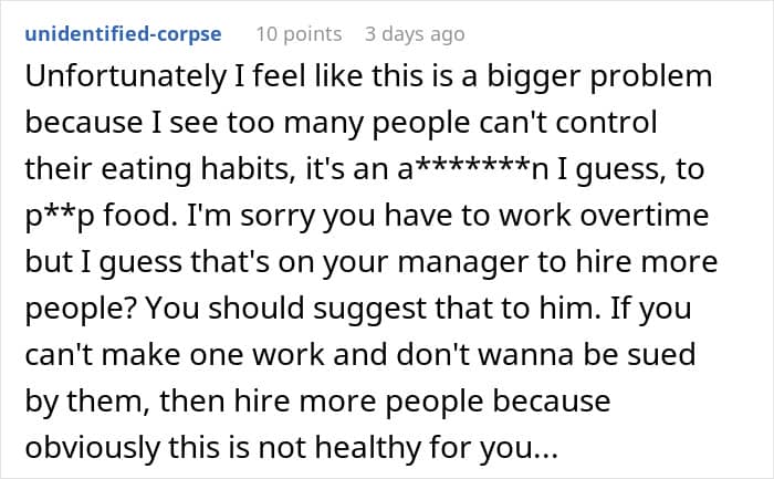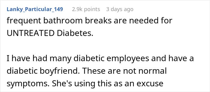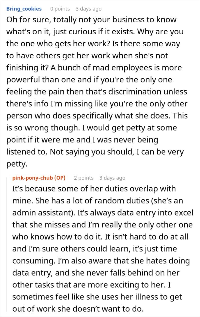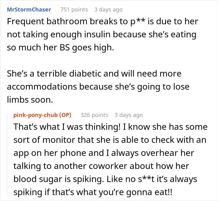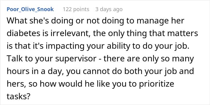 A woman is at her wits’ end because of her diabetic co-worker, who she says insists on eating food she knows she shouldn’t. Apparently, the worker gets sick frequently, and when she does, her colleagues are forced to do her work. The woman says she often finds herself working overtime to finish her sick co-worker’s tasks. Management is scared of being sued, so they’ve refused to intervene.