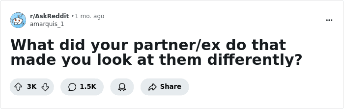 Someone asked “What did your partner/ex do that made you look at them differently?” and people shared their examples, both good and bad. So get comfortable as you scroll through, upvote your favorite examples and be sure to add your own thoughts in the comments below.