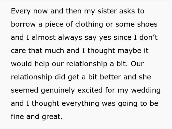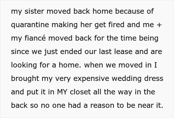 The sister got fired and had to move back home, while the OP also moved back home with her fiancé as they were looking for a new home. The OP, looking forward to her wedding had bought an expensive wedding dress and kept it in her closet. Now, her sister had a habit of borrowing her clothes which she didn’t mind as she thought it could help their relationship a bit.