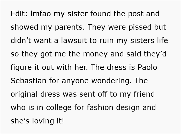 Today’s Original Poster (OP) probably couldn’t have ever imagined that her wedding dress would be ruined by her sister after moving back home. Still, she thought that was the most disappointing thing to happen until her parents and other relatives gave their two cents.