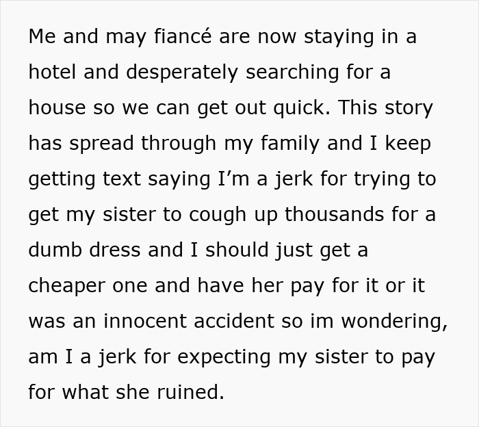 When she demanded her sister pay for the damage, her parents sided with the sister, saying that she couldn’t afford the thousands owed and then accused her of overreacting. In fact, it escalated so much that she and her fiancé had to move into a hotel while texts from relatives calling her a jerk flooded in.