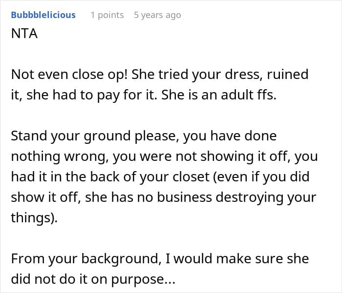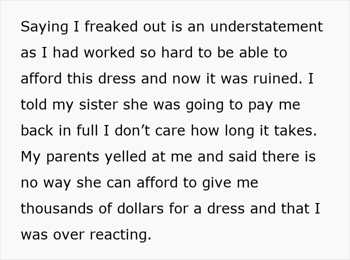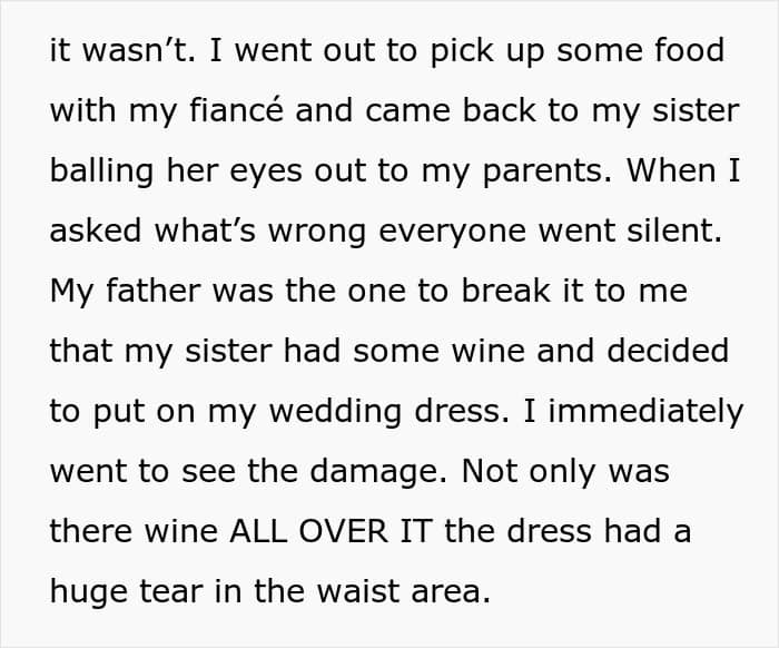 However, one day the OP returned from picking up food to find her sister in tears. Apparently, her sister had decided to try on the wedding dress after drinking wine which resulted in stains all over the fabric and a large tear at the waist. The damage wasn’t minor, it completely ruined the dress, and the OP understandably lost it.