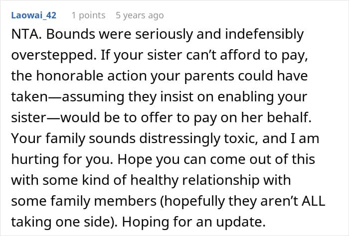 Netizens supported the OP, with nearly all of them agreeing that her sister’s actions were intentional or, at the very least, extremely careless. They insisted that the sister should make amends either financially or legally, and also criticized their parents for siding with the sister.