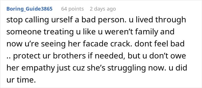 She felt that the woman deserved it after what she made her go through, but the poster also felt bad for her brothers