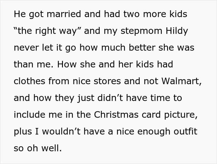 From mocking OP’s Walmart clothes to excluding her from Christmas card pictures because of it, this woman was absolutely cruel. She felt no shame that she was tormenting a child, but then karma came knocking on her door. It all started when one of her kids came out as trans, and she pretended to be very supportive, but the truth was something else.