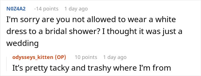 Moreover, Hildy also came dressed in a white dress at OP’s bridal shower, without even zipping it up properly. The poster just shook her head in shame, but the truth was that she was enjoying watching how the woman was destroying her own life. She just felt bad for her brothers, and also thought that she was a bad person to be happy at Hildy’s misery.