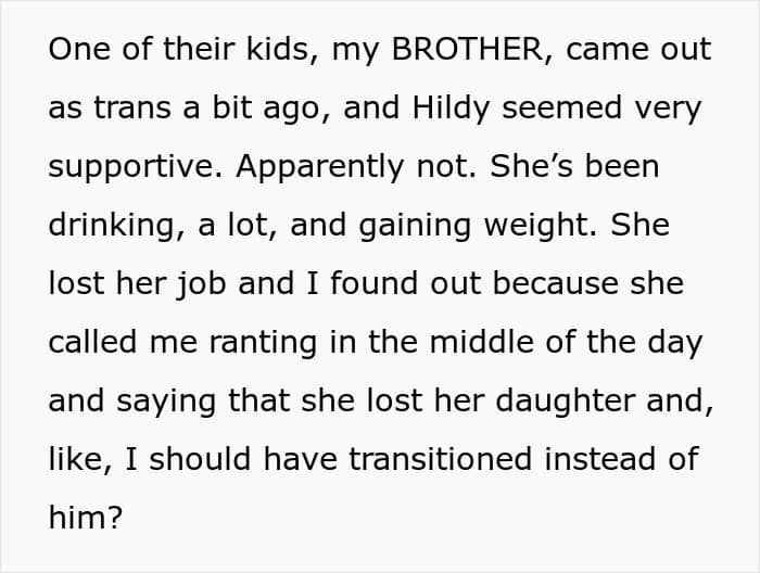 She started drinking a lot, gaining weight, and even lost her job. Apparently, she called OP and cursed her, claiming that she should have been trans instead. The frustrated poster called her dad and told him about it. He wanted Hildy to go to therapy, but our lady didn’t really care about it at all.