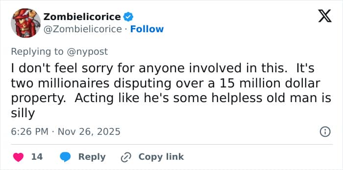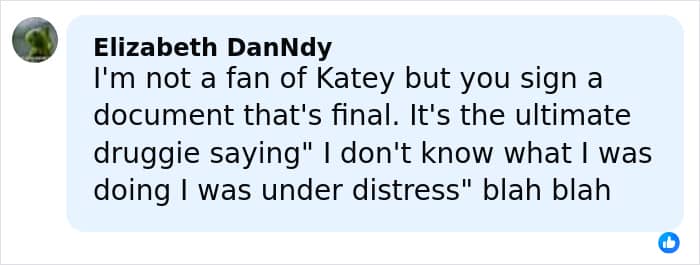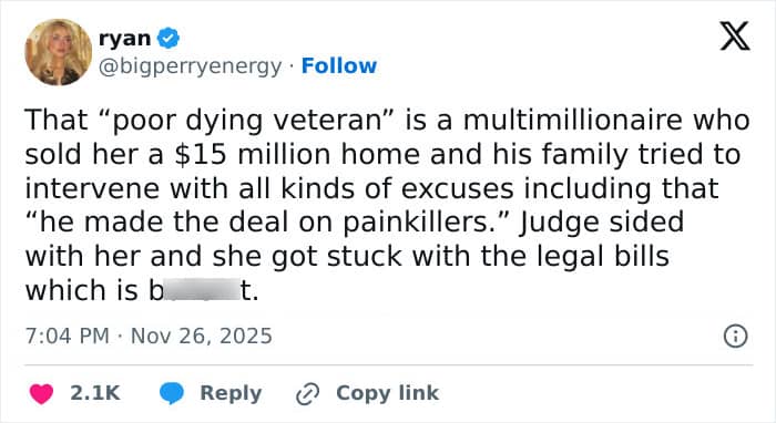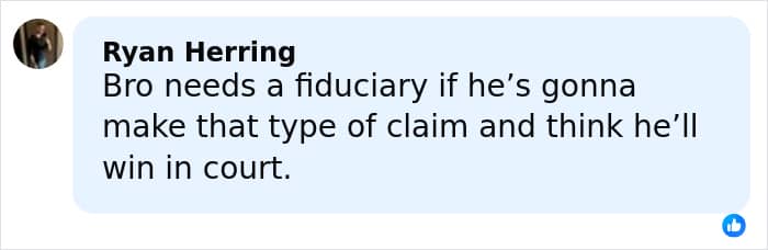 Another added, “He screwed up. Not her fault. He was competent when he signed the papers. Even the judge agreed. His own fault. He found out who it was and wanted more money.”