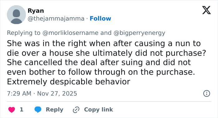 A third chimed in, “She did everything by the book. It’s unfair to paint her as the villain when she simply exercised her legal rights like anyone else would.”