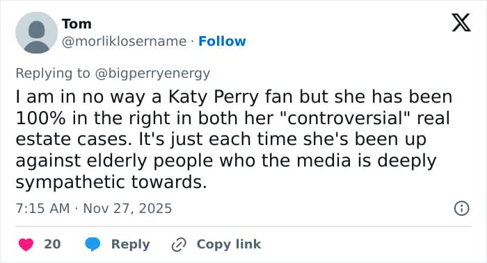 HighlightsKaty Perry launches a new $5 million lawsuit against 85-year-old veteran Carl Westcott amid their years-long Montecito mansion battle.Many netizens side with the Grammy nominee, arguing she’s firmly within her legal rights.However, a new twist in the case, along with another court hearing set for the end of the year, has further escalated the controversy.