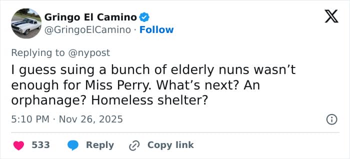 One fan even pointed to Perry’s controversial past legal battle with an 89-year-old nun in 2018, writing, “God, I can’t stand this woman. Just when you think your opinion of this nun-harasser can’t get any lower, she bests herself.”