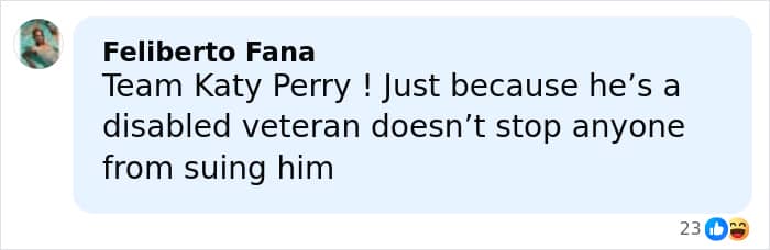 One supporter wrote, “Team Katy Perry! Just because he’s a disabled veteran doesn’t stop anyone from suing him.”