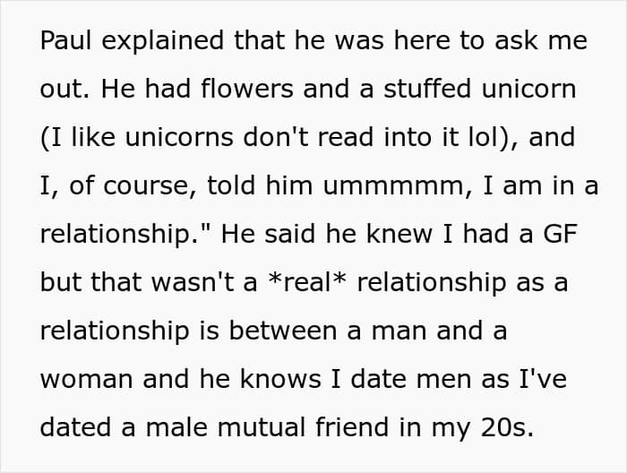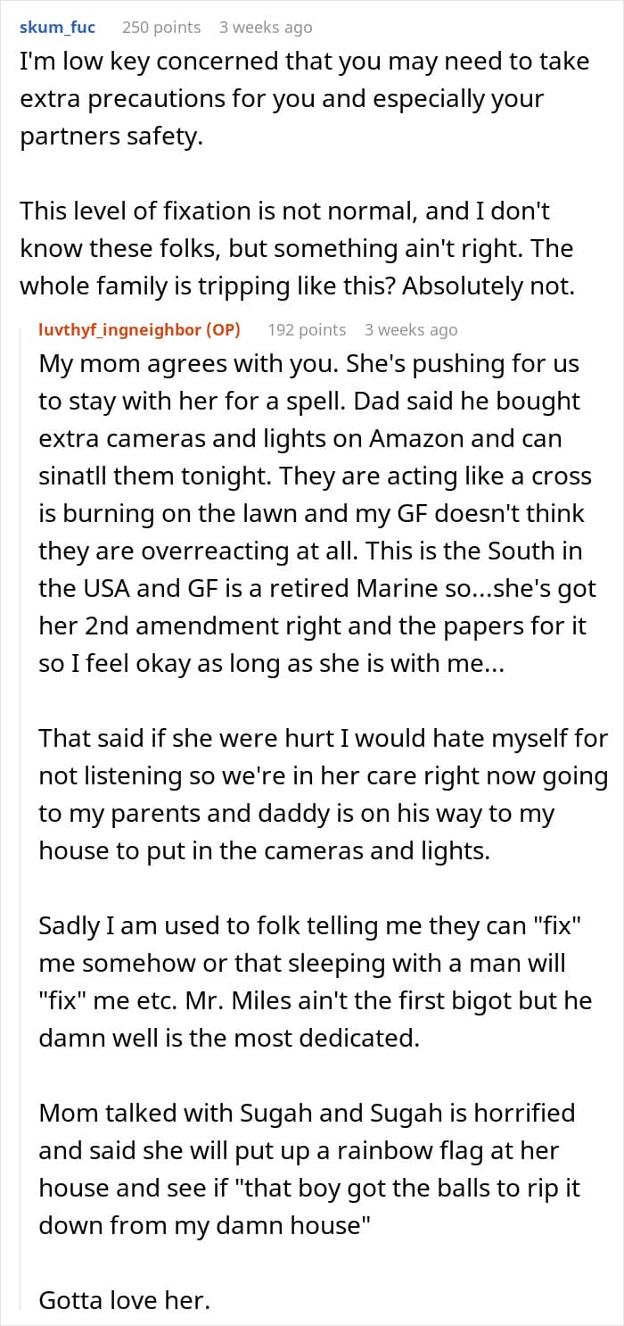 One man took the phrase “love thy neighbor” to a whole new level, when he insisted his queer neighbor break up with their girlfriend and marry his son instead. He refused to believe the relationship was “real” – and acted out his disdain in the most despicable way. What followed was an epic battle between two women in love and one very entitled man.