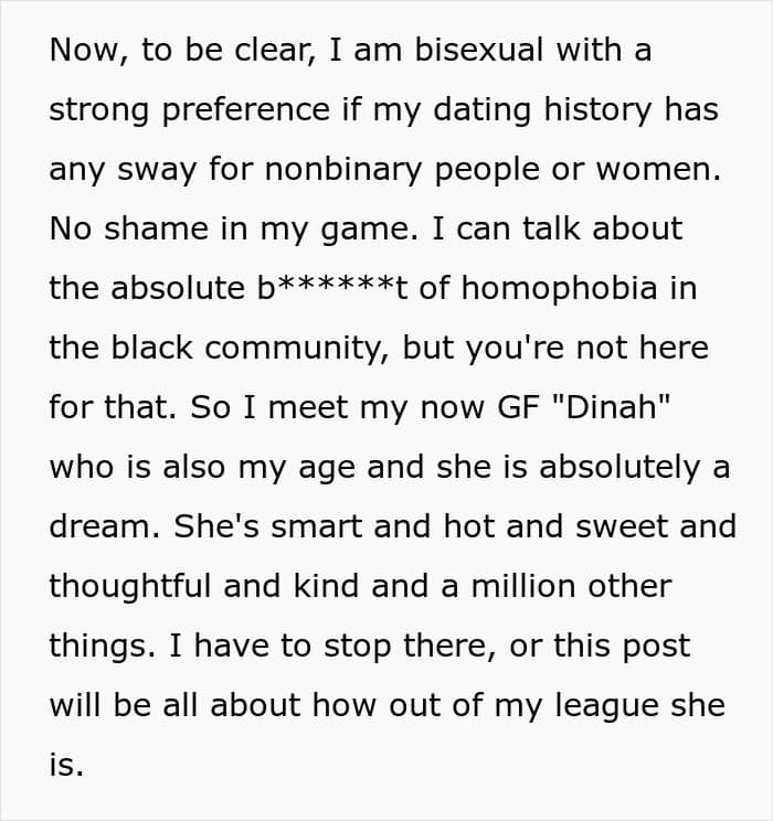 “Well the Mr. Miles saga continues so to pick up from my last post, the BBQ happened. It was fun. Had my parents and chosen family over (open invite to my community so some neighbors too) and Dinah’s twin even came and by twin I mean they’re not actually twins (image THAT much hotness doubled. Lawd.) But siblings born on the same day a few years apart. For this I will call him David (M30s…? Idk I never remember).