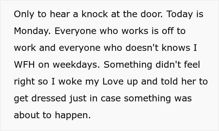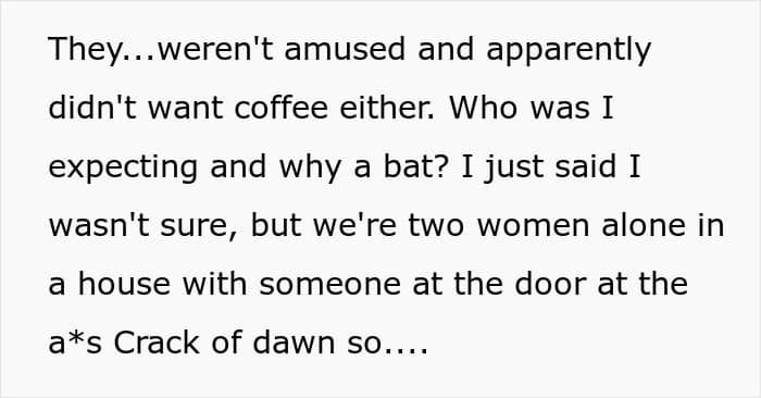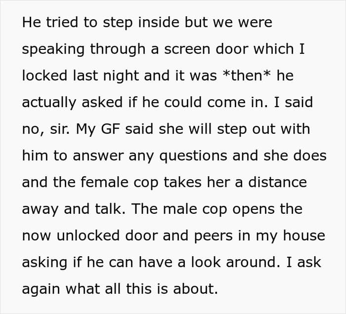 “She opens the door with the chain on and this pleasant looking man is smiling at her so she assumes he is a salesman. She just asks if our no soliciting sign is there and is about to close the door at that but he said he’s not selling anything, he’s an officer with the HOA.