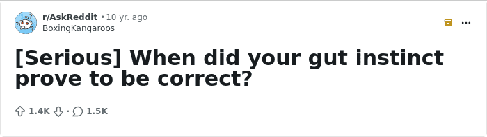 Four years ago, when I was 22, I was living at home with parents and finishing up undergrad. My dad was gone a lot more than he usually was, and I suspected he was cheating on my mom. I even asked him point blank if he was (he said no). I admitted this suspicion to my boyfriend at the time, who kind of shrugged it off and said, “I’m sure everything’s fine.” Two weeks after I graduated, my dad told us he was moving out and moved in with his colleague (with whom he had been having an affair). They’re getting married in August. My then-boyfriend (who I guess I’m sort of seeing again) said, “After that, I learned to always trust you and your intuition.”.
