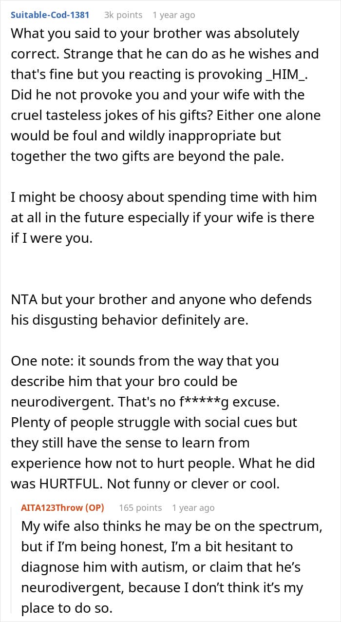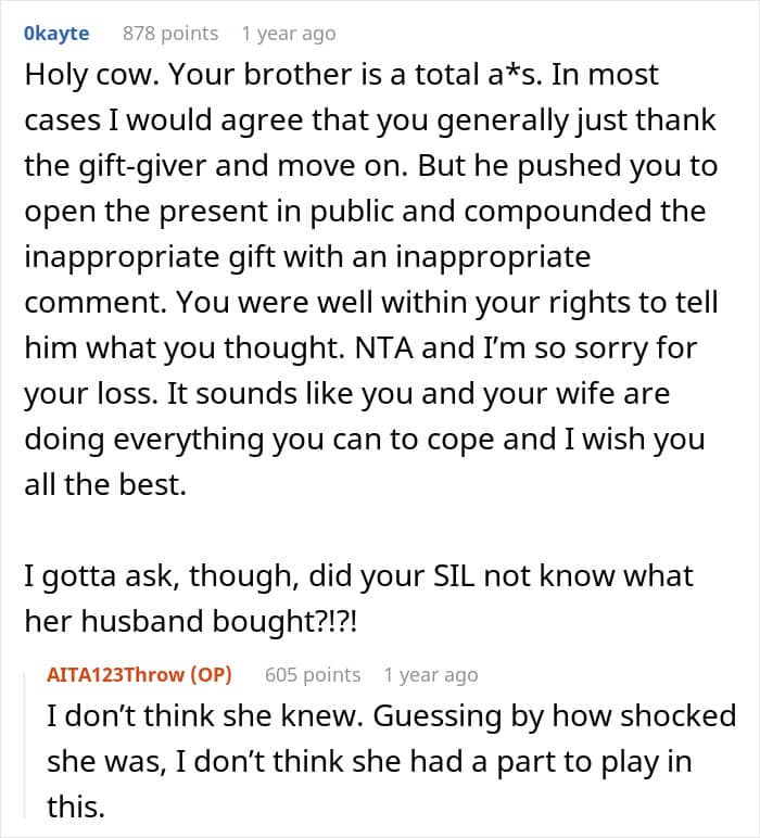 For instance, a man opened up about his experience of anger and grief on Reddit. The author noted that he and his wife, who had lost their 3-year-old son, had been attending therapy and participating in support groups to cope with their grief. He then recounted a family gathering where his socially awkward brother presented his wife with a baby’s romper and lingerie, suggesting they were gifts to “motivate” their marriage. Shocked by the inappropriate gesture, he confronted his brother. Continue reading to know more about the entire incident.