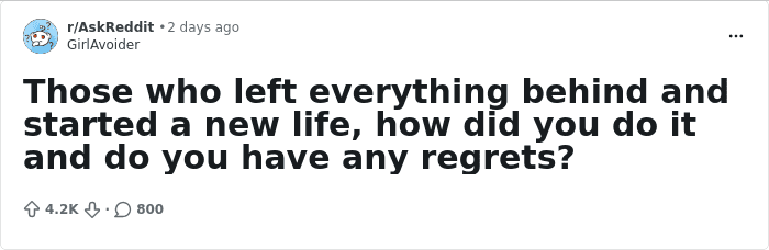 There’s a lot of inertia in our lives, and it can keep us moving in the same direction even after that path stops making sense. Whether because of our own mistakes or circumstances outside our control, we can end up stuck in a terrible situation, just going through the motions while the fire inside us slowly dies down. The idea of starting over often seems terrifying, but at a certain point, reinventing yourself might be the only way to survive. A few days ago, Reddit user GirlAvoider asked people who left it all behind why and how they did it. Here are some of the most memorable stories they’ve received.