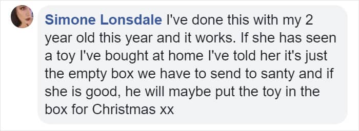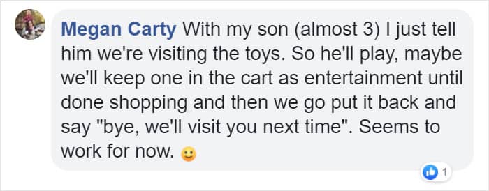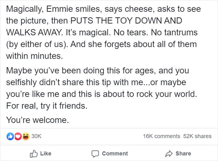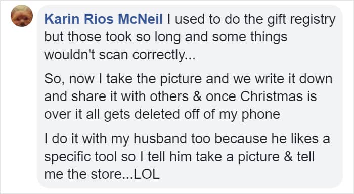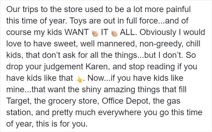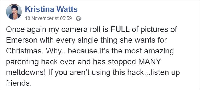 “A lot of people have been criticizing me for not just ‘saying no,’” she added. “Believe me, my children hear ‘NO’. A lot. This post was just something fun and quick I threw up on Facebook one night. I’m not trying to be a parenting guru, I’m by no means the perfect parent. I’m just another mom, running all the Christmas errands, trying to make shopping a little easier and a little more fun. I’m just trying to do my best and raise decent humans. This hack is just another way to prevent some tears and get through. Plus, how cute is Emmie in all these pictures on my phone?!”