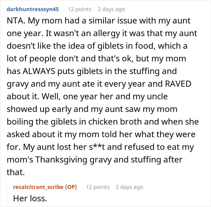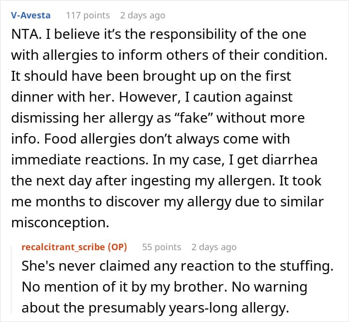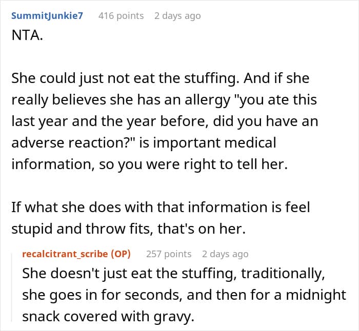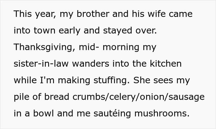 RELATED:A woman prepared her usual turkey stuffing for a Thanksgiving meal, but her SIL claimed she was allergic to one ingredient