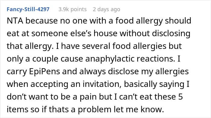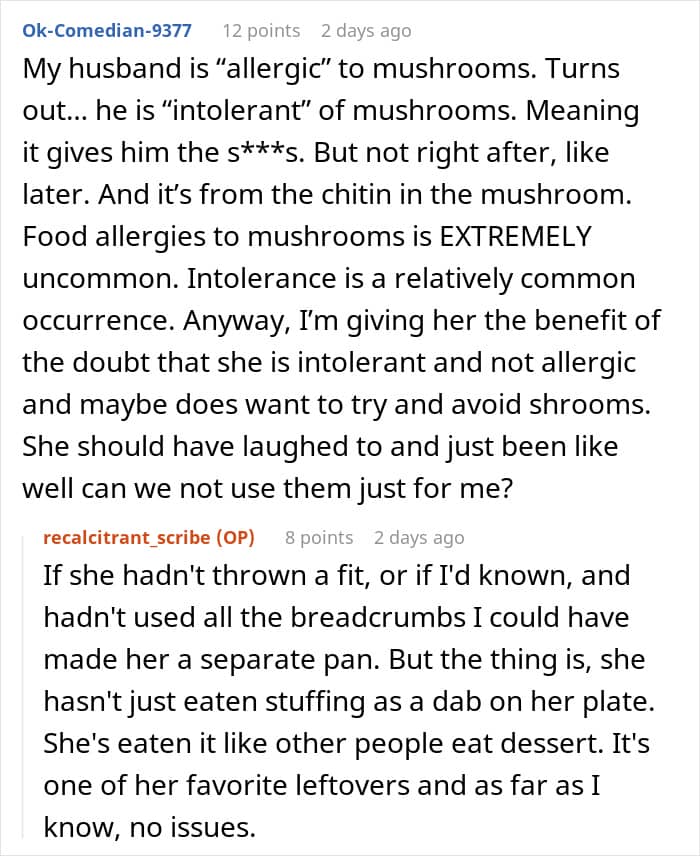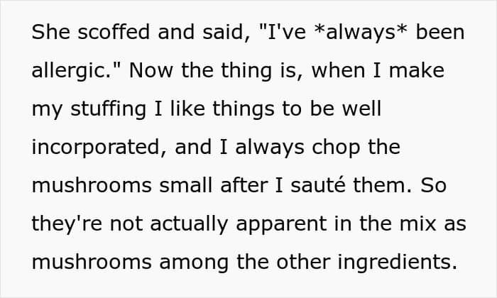 This woman, for example, claimed to have a mushroom allergy when she saw her sister-in-law sautéing mushrooms for the Thanksgiving turkey stuffing. But her statement seemed peculiar, since she had never had the allergy before and had eaten the same mushroom stuffing every year. After the sister-in-law laughed in her face, family drama ensued. So, the cook started wondering if her reaction was too harsh.