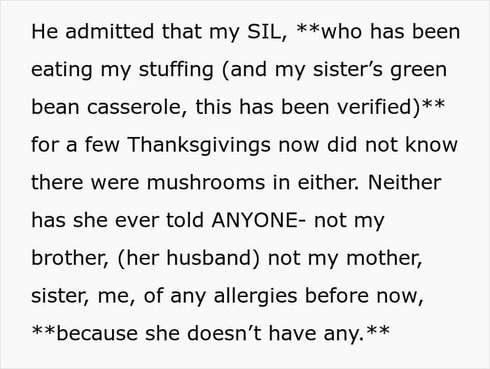 In the update, the Thanksgiving host revealed that her sister-in-law might have a phobia of mushrooms. This could explain why she freaked out after seeing mushrooms in her food despite having eaten them previously without knowing they were there.