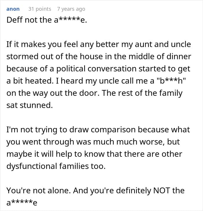 RELATED:A trauma victim turned to the internet for help after sharing how Thanksgiving dinner with her family turned into a nightmare situation