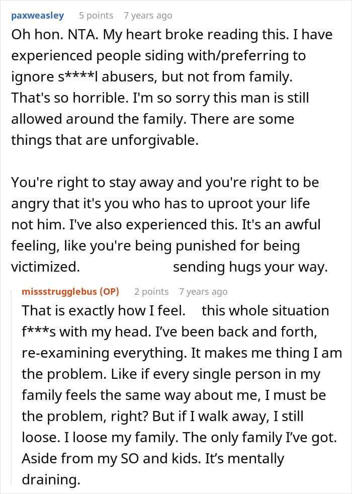 When somebody in your family is a monster who has taken advantage of you, you obviously don’t want to be anywhere near them. But when your other, normal relatives insist that they want to see you over the holidays and invite you over, you actually expect them to be present.