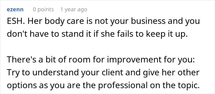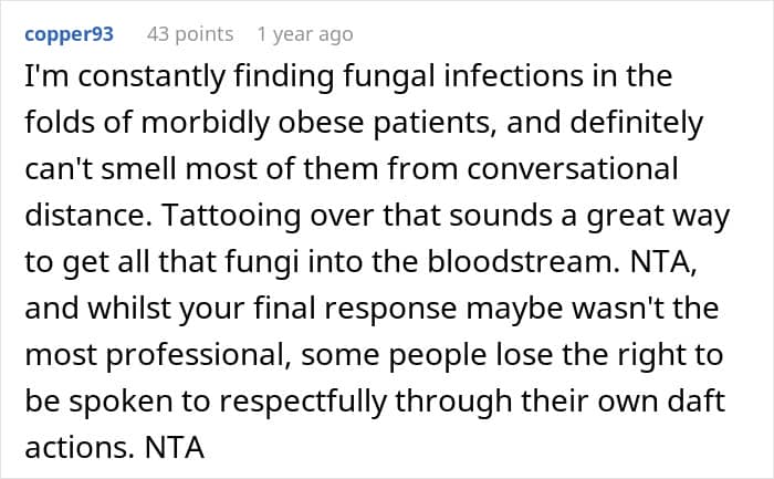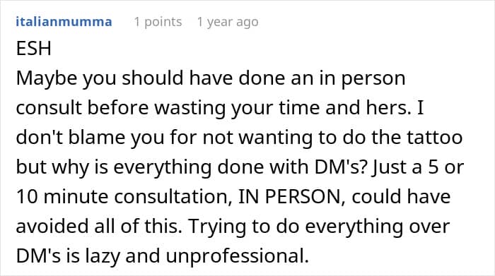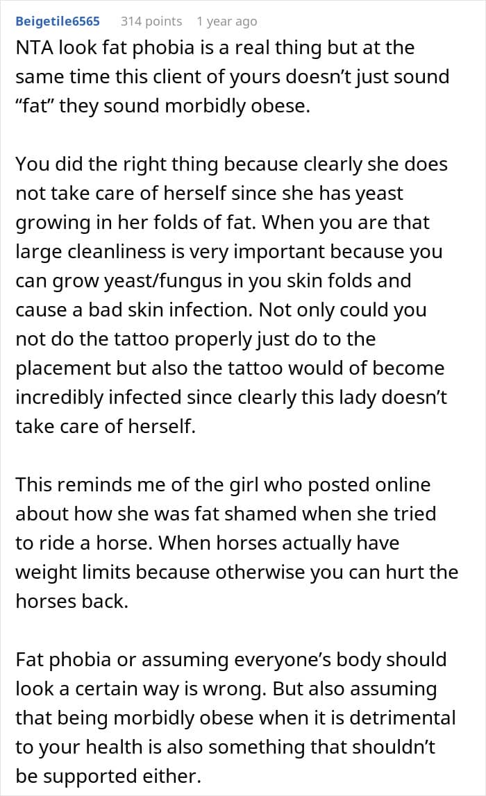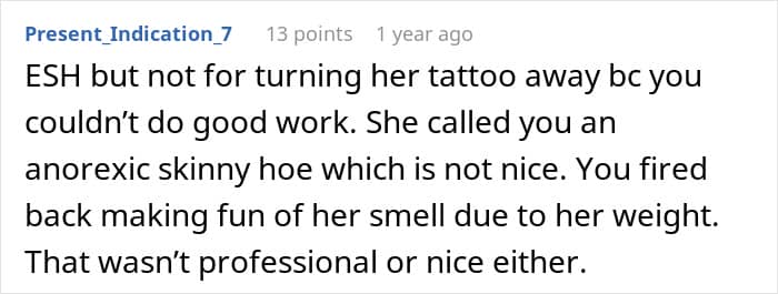 This is what happened to the OP of this story. She, a tattoo artist, already agreed on the design and placement of a tattoo with her client. But when the client showed up at the salon, the artist decided that her initial design wouldn’t be possible due to the woman’s plus-sized body. After a verbal altercation with the client, the OP came to Reddit to ask others whether her behavior was inappropriate.
