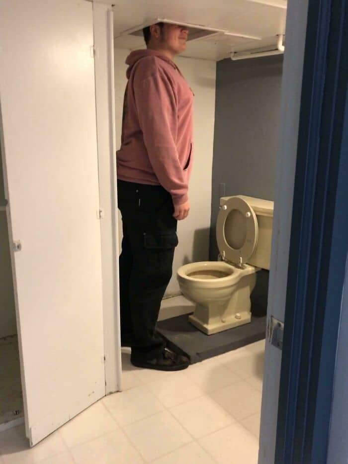 #15 This Bathroom In My Dads New House. I’m 6’1″. The Room Is So Short They Had To Cut Holes In The Ceiling Over The Toilet And Sink So You Can Stand Up
