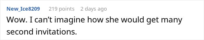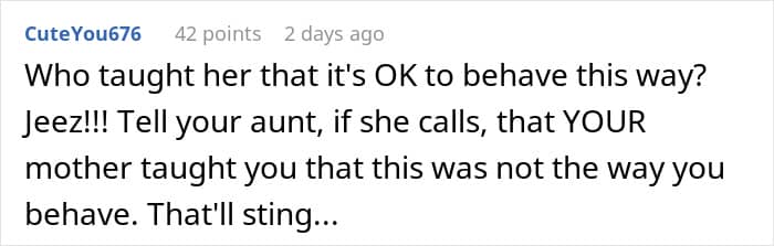 However, her cousin didn’t like the answer, and the OP still didn’t budge. Now, she noted that her cousin hadn’t complained to other family members yet, but she suspected her aunt would eventually weigh in. Fortunately, the whole family already knew the cousin wasn’t exactly a beacon of etiquette. Still, the OP decided she wouldn’t be inviting the cousin to future events.