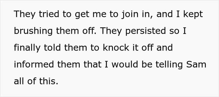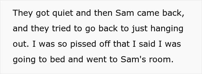 At first, she tried to deflect, but they kept pushing. Finally, she shut it down, told them it was messed up, and made it clear she planned to tell the boyfriend what they said. Her boyfriend returned and the friends acted like they hadn’t just been trash talking him in his absence, and this annoyed the OP so much that she got up and left for her boyfriend’s bedroom.