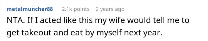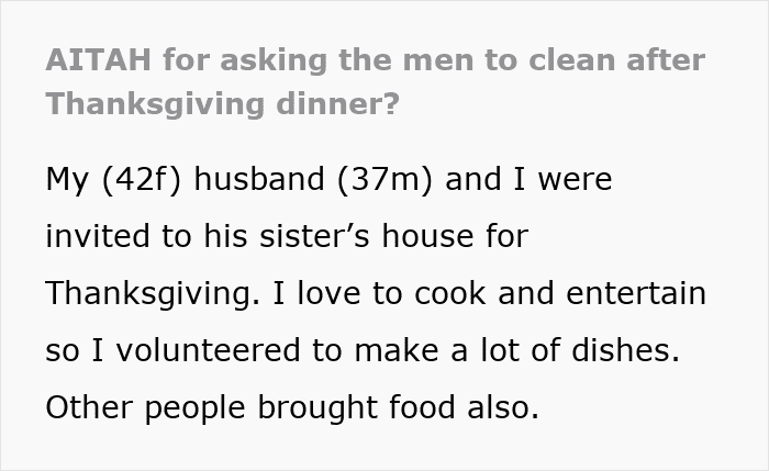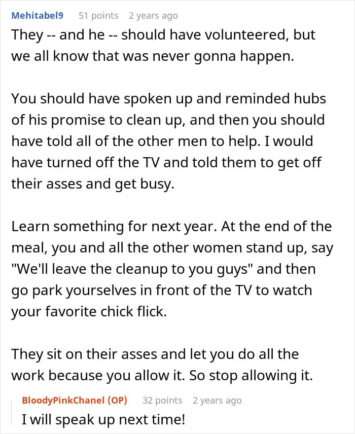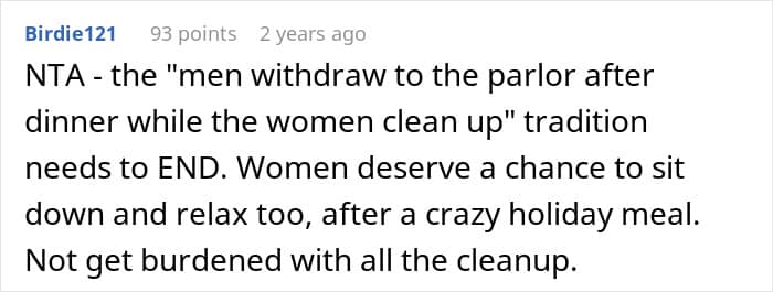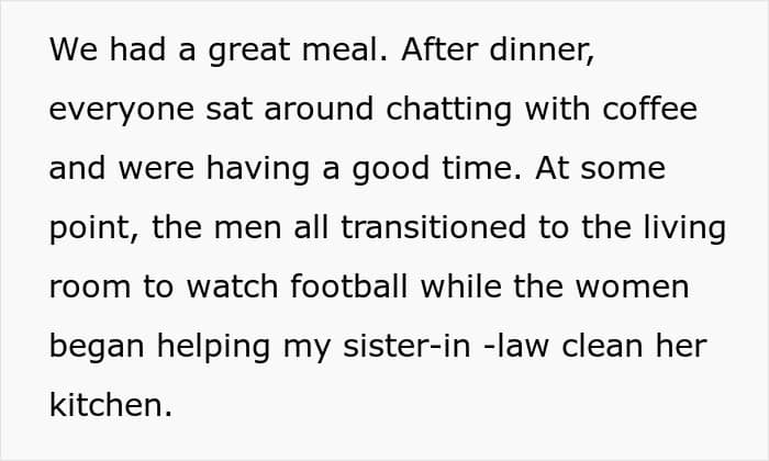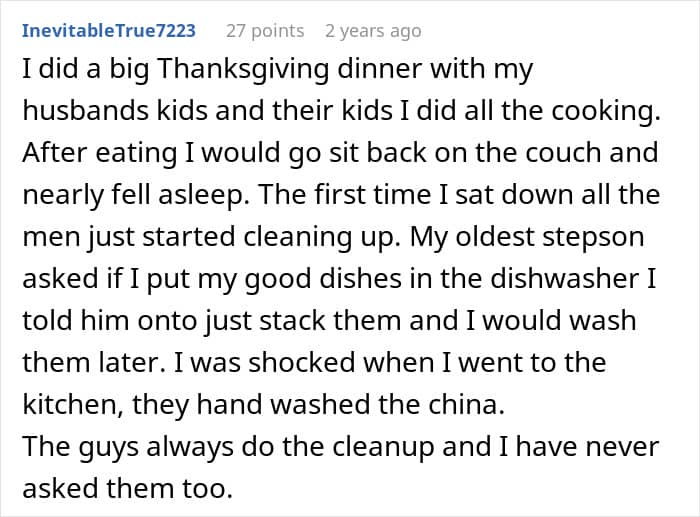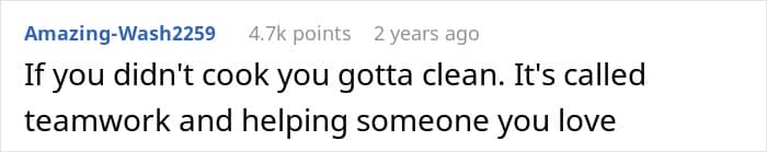 Now OP’s wondering if expecting the non-cooks (aka all the men) to grab a sponge and get stuck in is really that outrageous. After all, if you enjoy the feast, you rinse, at least. Her frustration wasn’t about drama, but fairness, teamwork, and finally calling out a pattern everyone else has tiptoed around for far too long.