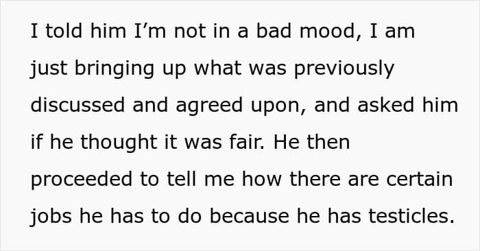 On the drive home, OP asked her husband why he hadn’t stepped up like they discussed. Instead of an explanation, he accused her of having a “victim complex.” When she pressed further, he claimed there were jobs he did “because he’s a man,” completely sidestepping the very specific deal they’d made.