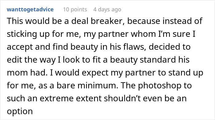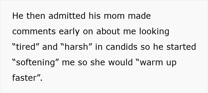The poster’s boyfriend tried to justify his behavior by explaining that he had just done it to make his mom warm up to her faster. He thought that by retouching her images, it would please his critical mother and that she’d no longer make comments about the OP looking “tired” or “harsh.”