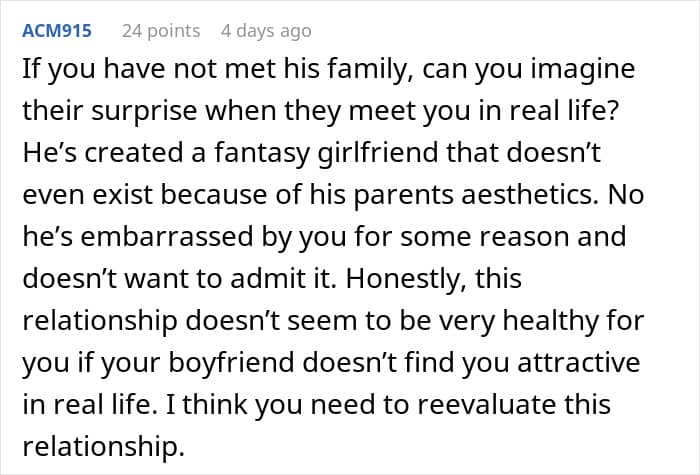The poster explained that she had been dating her boyfriend for two years and that his family only knew about her through the photos that he sent them