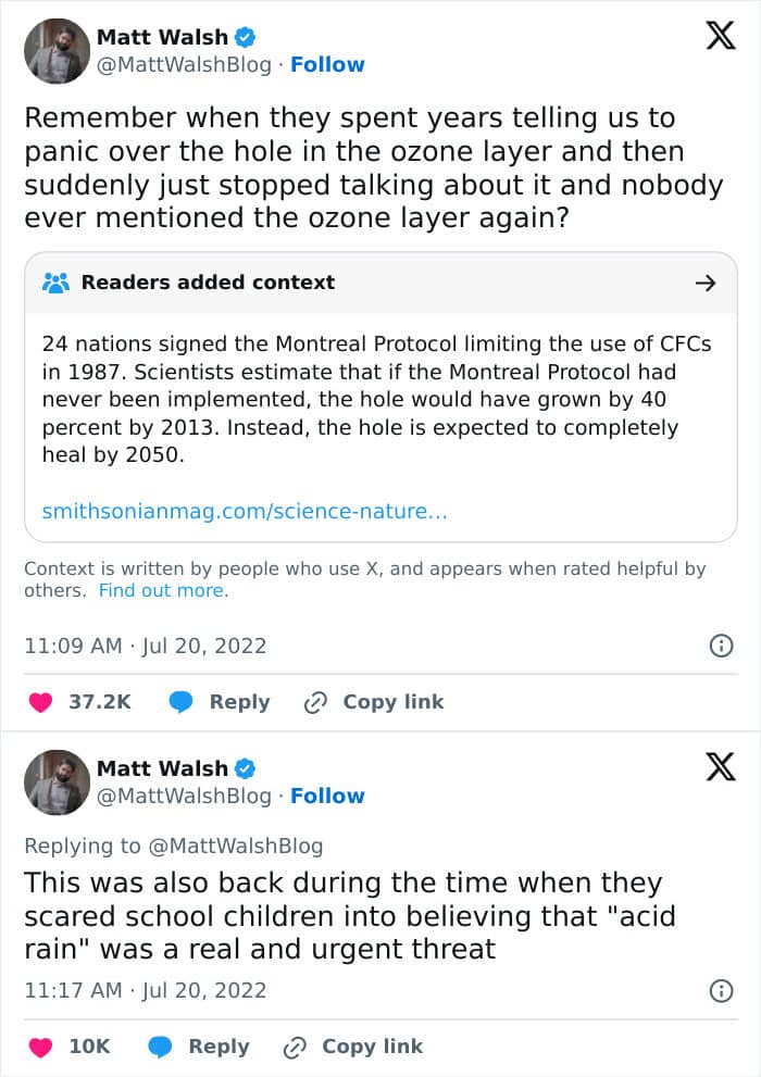 #9 Matt Walsh Of The Daily Wire Is Really Not The Brightest Star In The Sky. The Ozone Was Indeed Depleting And It Was A Legitimate Concern. It Turned Out That A Major Cause Of This Was Cfc’s. The Use Of Cfc’s Was Then Heavily Reduced And Things Got Significantly Better