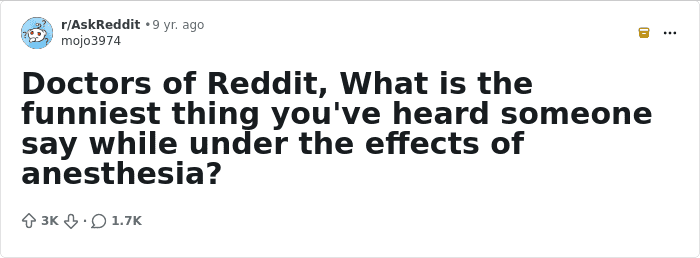 And that’s exactly what unfolded when someone online asked people to share the funniest things they’d ever heard someone say while waking up from anesthesia. What followed was sheer chaos: off-the-wall confessions, bizarre comments, and moments so unintentionally funny you can’t help but crack up. Keep scrolling to see some of the funniest anesthesia moments people will never forget.