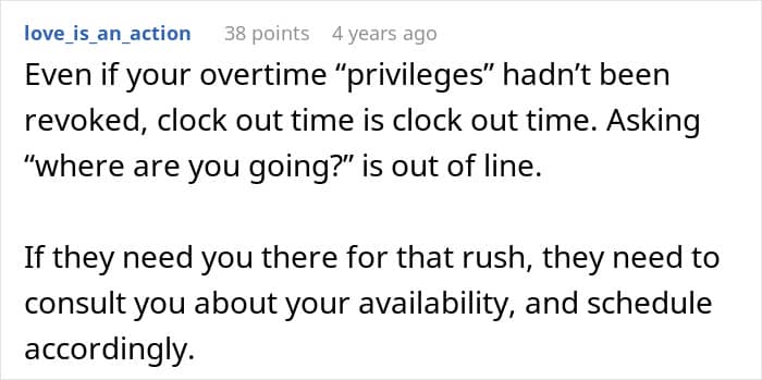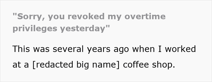 This Redditor used to work at a coffee shop and often picked up overtime to help her coworkers survive the busiest rushes. Her manager, however, decided she was doing too much and banned her from taking any extra hours. So the very next day, she followed that rule to the letter, clocked out right on time, and left the manager to deal with the inevitable chaos.