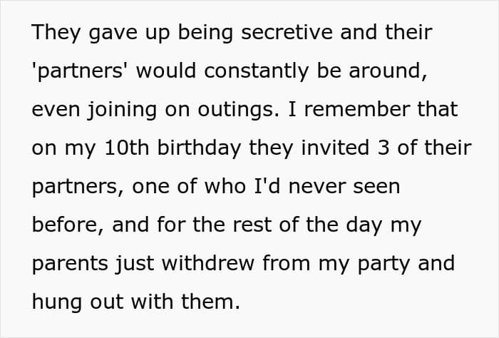 With time, parents stopped being so secretive about their partners and started to bring them along to events, like the post’s author’s 10th birthday. The fact that they brought them along wasn’t that bad, but it was the fact that the parents paid most of the attention to said partners, even though it was something as significant as their kid’s birthday.