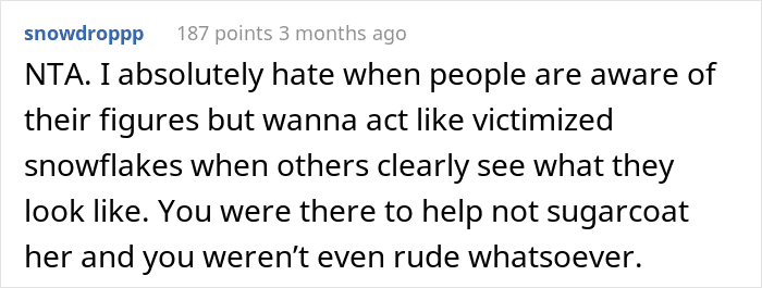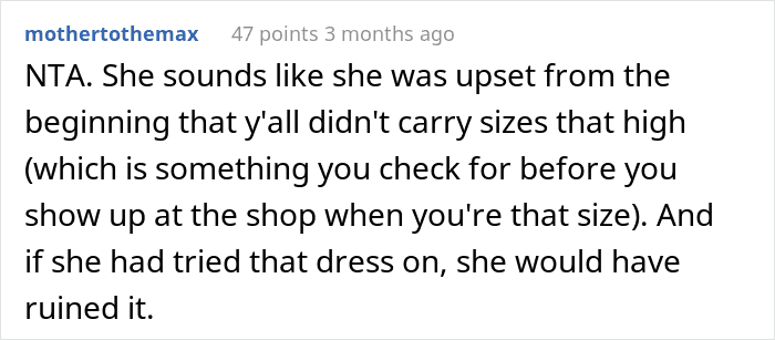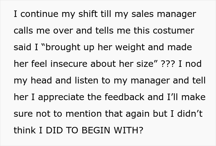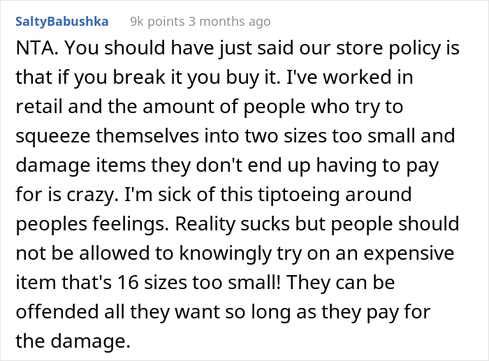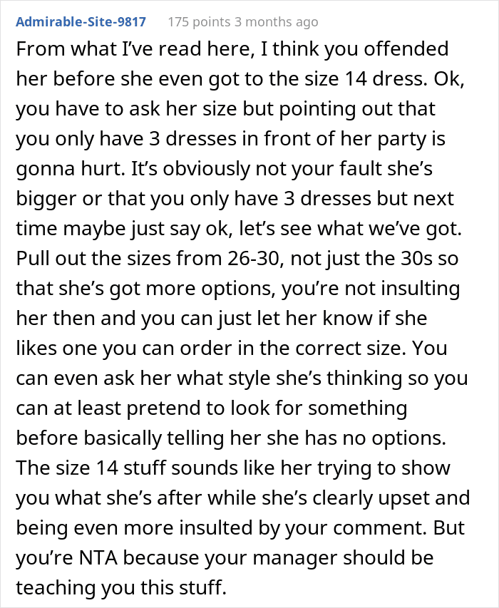 The fallout from the sales associate’s comment was almost immediate. The client tried to get her in trouble with her manager. Most AITA community members thought that it was the client who was being a jerk, not the saleswoman.