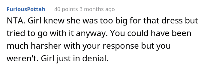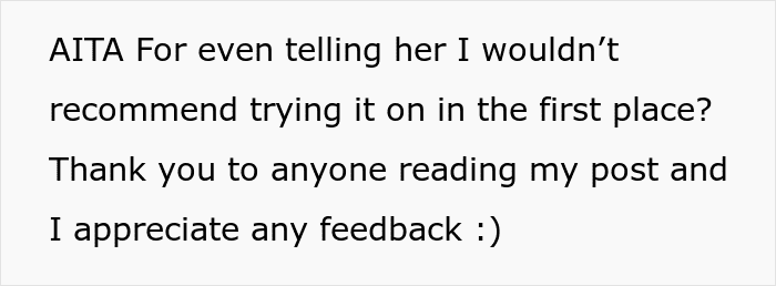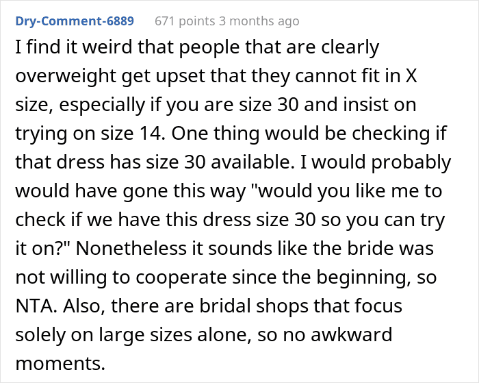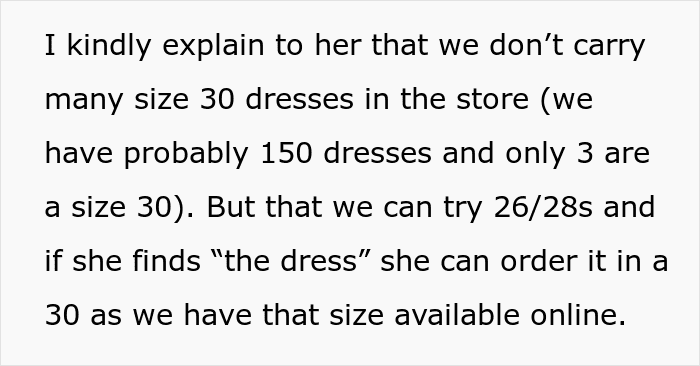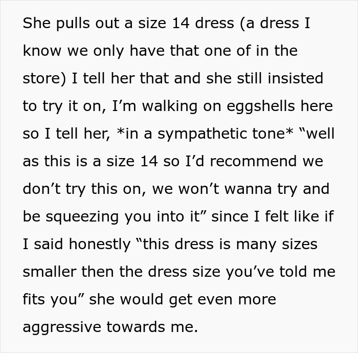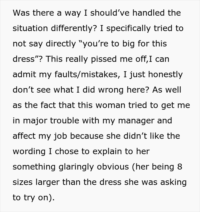 One redditor, who works as a bridal sales associate, turned to the AITA subreddit for advice on whether or not she messed up when dealing with a rude client who wanted to try on a dress that was clearly far too small for her. The client wears size 30 dresses and wanted to put on a size 14 one. The saleswoman tried to be polite in how she handled things, but everything backfired.