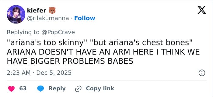 Ariana’s appearance became a point of discussion, with one saying, “If the light was bright enough behind her she would light up like an x-ray.”