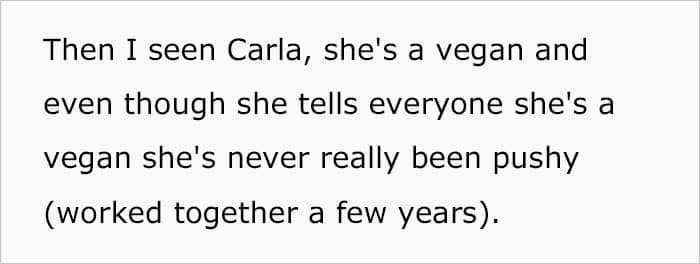 As the Reddit user highlighted, Carla is a vegan and although she does tell everyone she’s a vegan, they have worked together for several years and it has never come across as her being pushy about veganism.
