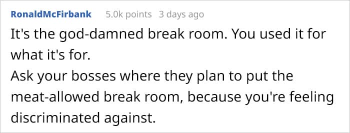 After the incident, throwaway1035782 had some thoughts and actually decided to ask the people online on AITAH, which has 2.6m followers, what their thoughts are on the situation. The post itself received 7.9k upvotes and 1.5k comments to date. However big or small the incident itself was, it sparked quite a few responses and debates among vegans and meat-eaters about how situations like this should be handled at work and in public spaces in general.