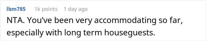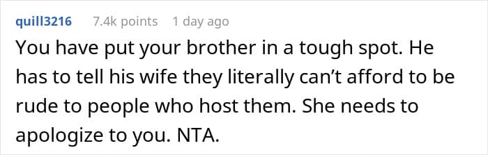 Community members discussed that OP was not in the wrong in this situation, and that the brother’s wife needs to understand boundaries and that she can’t afford to be rude to people who are hosting her. “You are coming home from work as a nurse. Minimum expectations are to be polite and courteous as guests,” one user wrote. “Going home after work should not be draining. She’s being made to feel unwelcome in her own home,” another added.