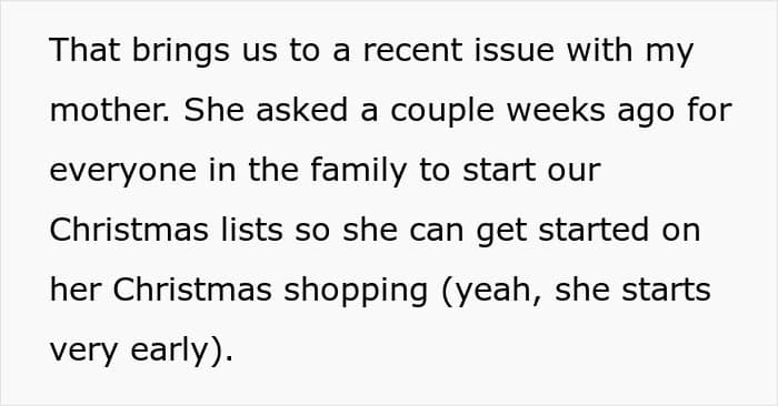 The woman’s mother asked the family to write things they want as gifts, but the woman is not excited about any presents, as she always ends up with too much stuff she can’t use