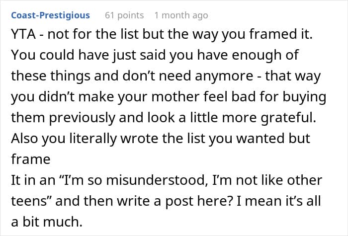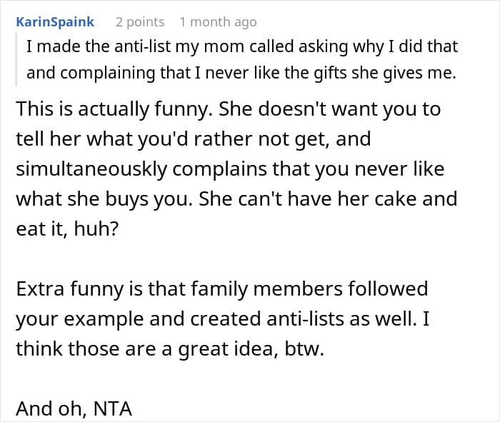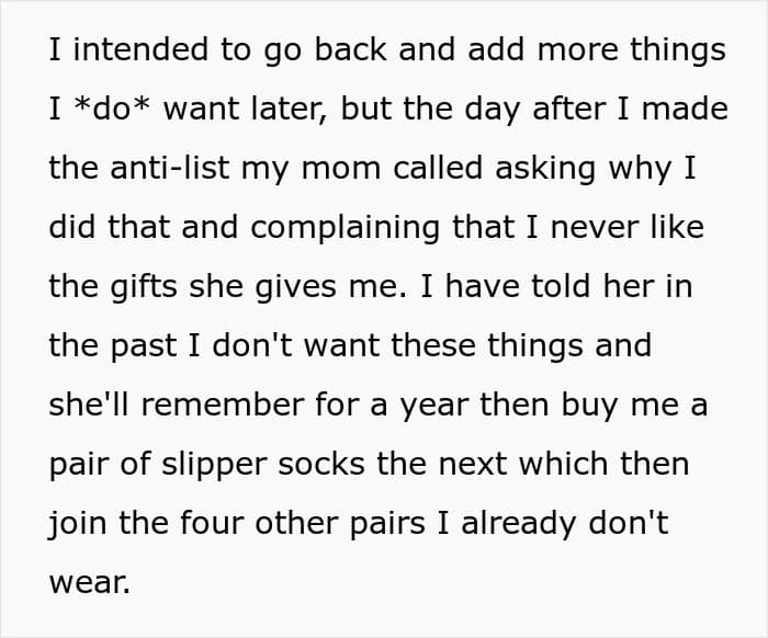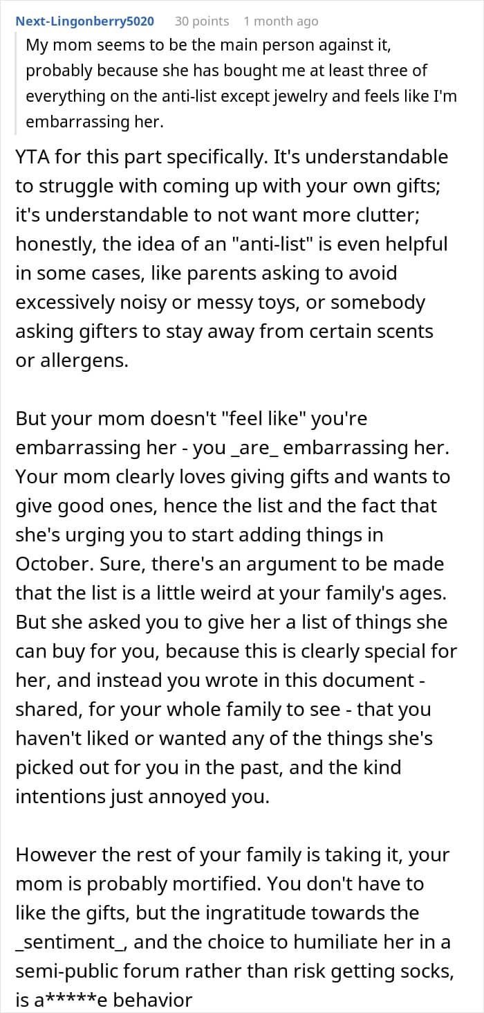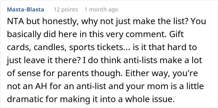 Mom’s reaction to her daughter’s anti-list, however, isn’t uncommon, as gift-giving can feel deeply personal, especially for parents. When a gift is rejected, even indirectly, it can feel like a rejection of the relationship or effort behind it. For mom, the anti-list might have hit a little too close to home, given her track record with past gifts.